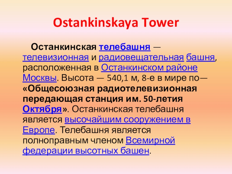 расположенная в Останкинском районе Москвы. Высота — 540,1 м, 8-е в мире по— «Общесоюзная радиотелевизионная передающая станция им. 50-летия Октября». Останкинская телебашня является высочайшим сооружением в Европе. Телебашня является полноправным членом Всемирной федерации высотных башен.