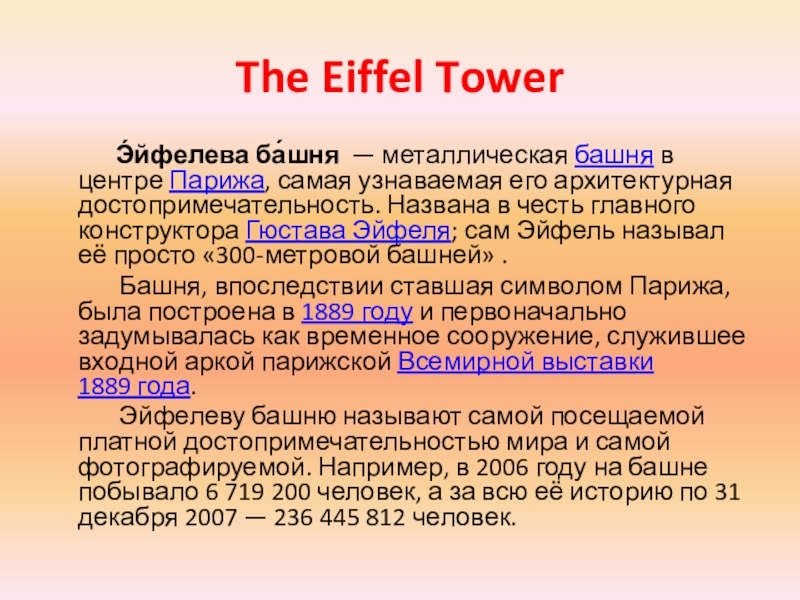 The Eiffel Tower      Э́йфелева ба́шня  — металлическая башня в центре Парижа, самая