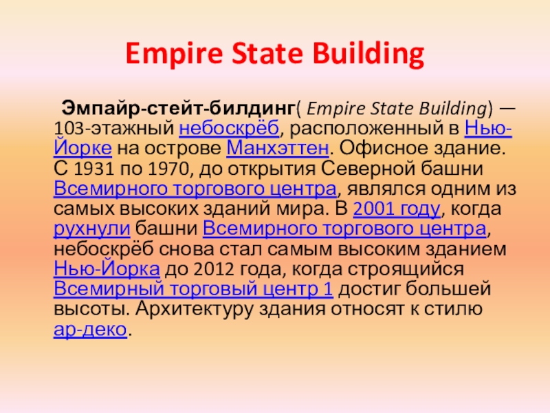 Empire State Building Эмпайр-стейт-билдинг( Empire State Building) — 103-этажный небоскрёб, расположенный в Нью-Йорке на острове Манхэттен. Офисное здание. С 1931 по 1970, до открытия Северной башни Всемирного торгового центра, являлся одним из самых высоких зданий мира.