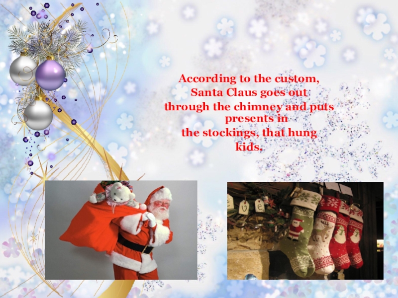 According to the custom,Santa Claus goes outthrough the chimney and puts presents inthe stockings, that hungkids.