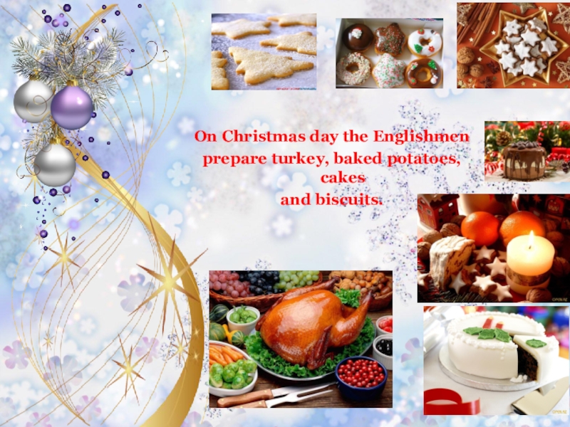 On Christmas day the Englishmenprepare turkey, baked potatoes, cakesand biscuits.