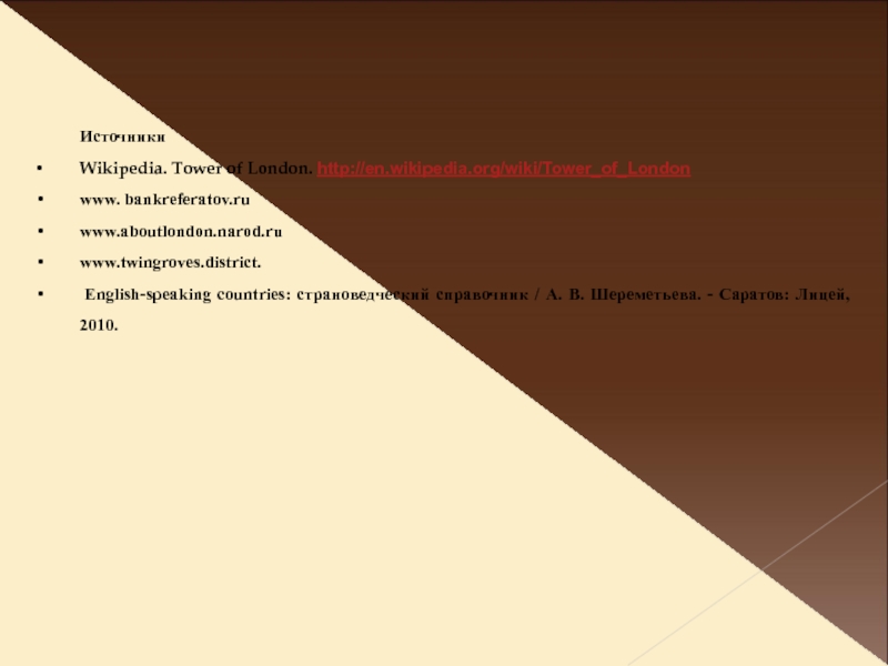 ИсточникиWikipedia. Tower of London. http://en.wikipedia.org/wiki/Tower_of_London www. bankreferatov.ru www.aboutlondon.narod.ruwww.twingroves.district. English-speaking countries: страноведческий справочник / А. В. Шереметьева. -