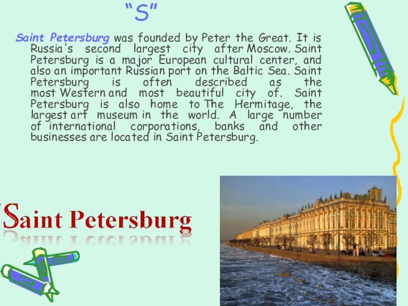 largest city after Moscow. Saint Petersburg is a major European cultural center, and also an important Russian port on the Baltic Sea. Saint Petersburg is often described as the most Western and most beautiful city of. Saint Petersburg is also home to The Hermitage, the largest art museum in the world. A large number of international corporations, banks and other businesses are located in Saint Petersburg.