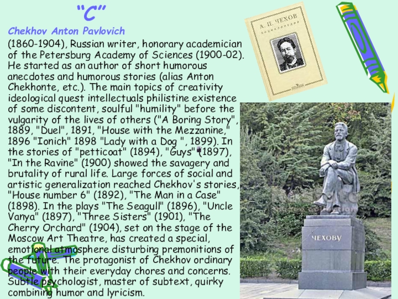 Academy of Sciences (1900-02). He started as an author of short humorous anecdotes and humorous stories (alias Anton Chekhonte, etc.). The main topics of creativity ideological quest intellectuals philistine existence of some discontent, soulful "humility" before the vulgarity of the lives of others ("A Boring Story", 1889, "Duel", 1891, "House with the Mezzanine," 1896 "Ionich" 1898 "Lady with a Dog ", 1899). In the stories of "petticoat" (1894), "Guys" (1897), "In the Ravine" (1900) showed the savagery and brutality of rural life. Large forces of social and artistic generalization reached Chekhov's stories, "House number 6" (1892), "The Man in a Case" (1898). In the plays "The Seagull" (1896), "Uncle Vanya" (1897), "Three Sisters" (1901), "The Cherry Orchard" (1904), set on the stage of the Moscow Art Theatre, has created a special, emotional atmosphere disturbing premonitions of the future. The protagonist of Chekhov ordinary people with their everyday chores and concerns. Subtle psychologist, master of subtext, quirky combining humor and lyricism.