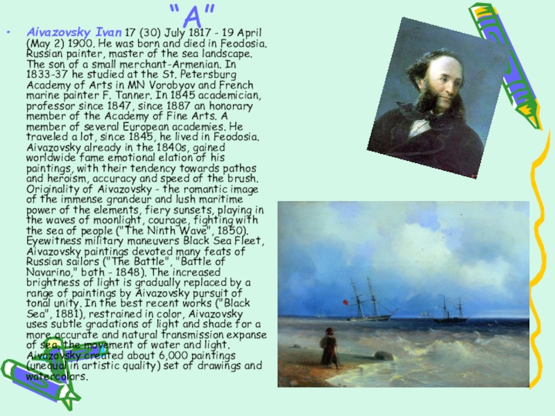 1900. He was born and died in Feodosia. Russian painter, master of the sea landscape. The son of a small merchant-Armenian. In 1833-37 he studied at the St. Petersburg Academy of Arts in MN Vorobyov and French marine painter F. Tanner. In 1845 academician, professor since 1847, since 1887 an honorary member of the Academy of Fine Arts. A member of several European academies. He traveled a lot, since 1845, he lived in Feodosia. Aivazovsky already in the 1840s, gained worldwide fame emotional elation of his paintings, with their tendency towards pathos and heroism, accuracy and speed of the brush. Originality of Aivazovsky - the romantic image of the immense grandeur and lush maritime power of the elements, fiery sunsets, playing in the waves of moonlight, courage, fighting with the sea of people ("The Ninth Wave", 1850). Eyewitness military maneuvers Black Sea Fleet, Aivazovsky paintings devoted many feats of Russian sailors ("The Battle", "Battle of Navarino," both - 1848). The increased brightness of light is gradually replaced by a range of paintings by Aivazovsky pursuit of tonal unity. In the best recent works ("Black Sea", 1881), restrained in color, Aivazovsky uses subtle gradations of light and shade for a more accurate and natural transmission expanse of sea, the movement of water and light. Aivazovsky created about 6,000 paintings (unequal in artistic quality) set of drawings and watercolors.