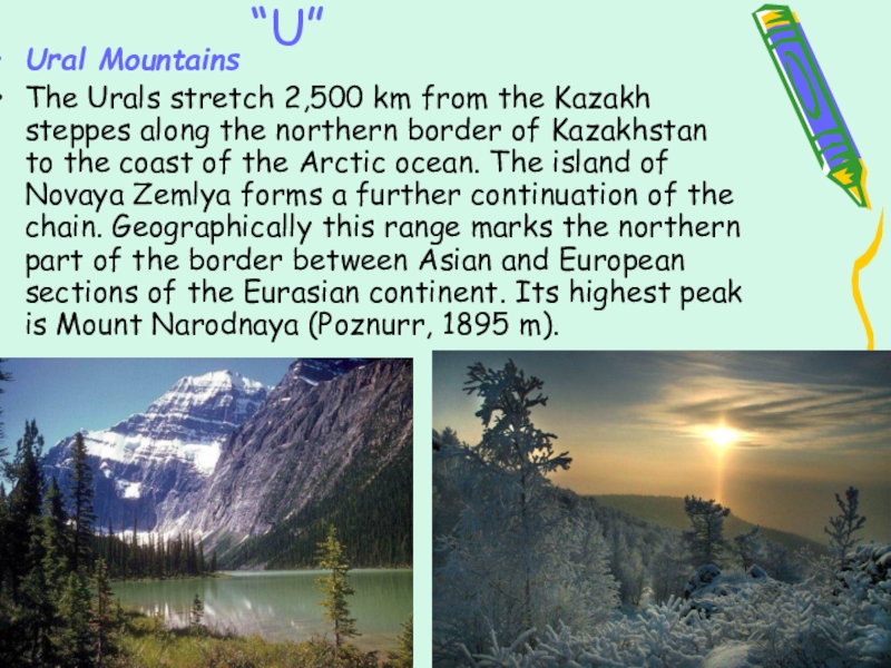 the northern border of Kazakhstan to the coast of the Arctic ocean. The island of Novaya Zemlya forms a further continuation of the chain. Geographically this range marks the northern part of the border between Asian and European sections of the Eurasian continent. Its highest peak is Mount Narodnaya (Poznurr, 1895 m).