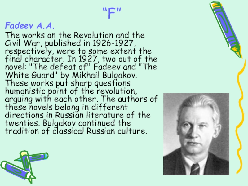in 1926-1927, respectively, were to some extent the final character. In 1927, two out of the novel: "The defeat of" Fadeev and "The White Guard" by Mikhail Bulgakov. These works put sharp questions humanistic point of the revolution, arguing with each other. The authors of these novels belong in different directions in Russian literature of the twenties. Bulgakov continued the tradition of classical Russian culture.