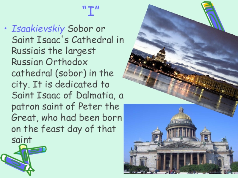 cathedral (sobor) in the city. It is dedicated to Saint Isaac of Dalmatia, a patron saint of Peter the Great, who had been born on the feast day of that saint