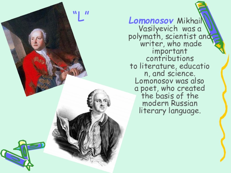 Lomonosov Mikhail Vasilyevich was a polymath, scientist and writer, who made important contributions to literature, education,