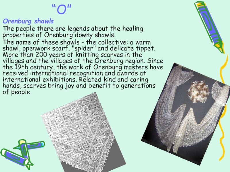 The name of these shawls - the collective: a warm shawl, openwork scarf, "spider" and delicate tippet. More than 200 years of knitting scarves in the villages and the villages of the Orenburg region. Since the 19th century, the work of Orenburg masters have received international recognition and awards at international exhibitions. Related kind and caring hands, scarves bring joy and benefit to generations of people