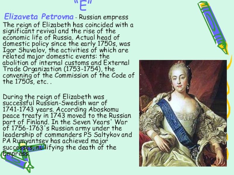 During the reign of Elizabeth was successful Russian-Swedish war of 1741-1743 years. According Aboskomu peace treaty in 1743 moved to the Russian part of Finland. In the Seven Years' War of 1756-1763's Russian army under the leadership of commanders PS Saltykov and PA Rumyantsev has achieved major successes, nullifying the death of the Empress.