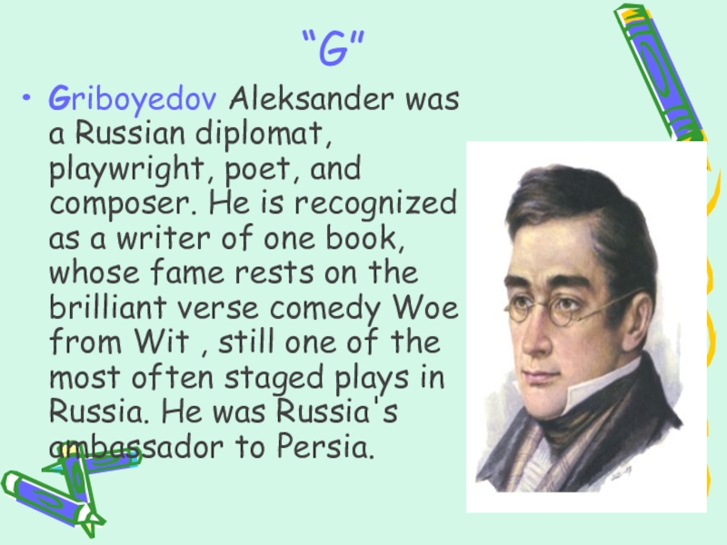 is recognized as a writer of one book, whose fame rests on the brilliant verse comedy Woe from Wit , still one of the most often staged plays in Russia. He was Russia's ambassador to Persia.