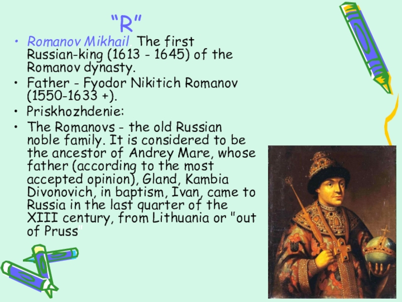 The Romanovs - the old Russian noble family. It is considered to be the ancestor of Andrey Mare, whose father (according to the most accepted opinion), Gland, Kambia Divonovich, in baptism, Ivan, came to Russia in the last quarter of the XIII century, from Lithuania or "out of Pruss"