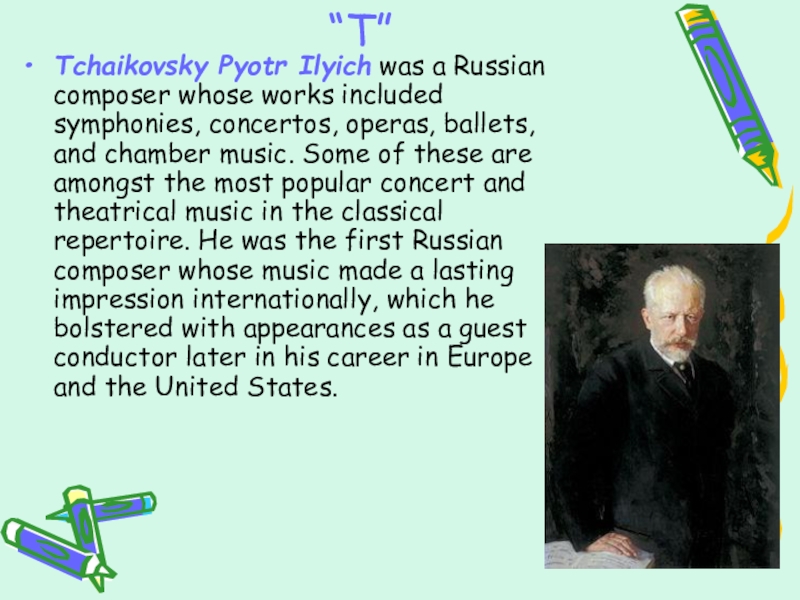 Tchaikovsky Pyotr Ilyich was a Russian composer whose works included symphonies,