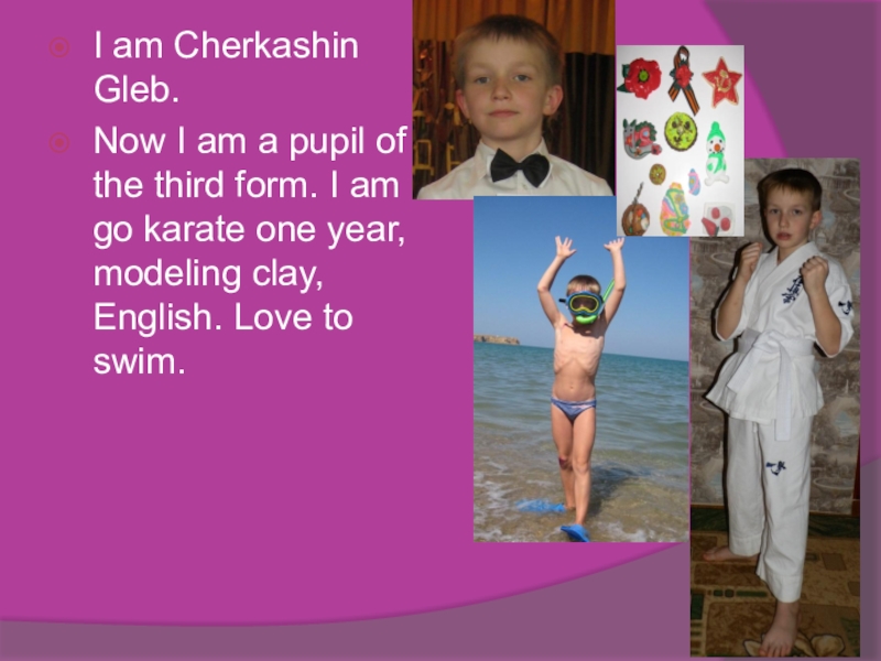 I am Cherkashin Gleb.Now I am a pupil of the third form. I am go karate one year, modeling clay, English. Love to swim.