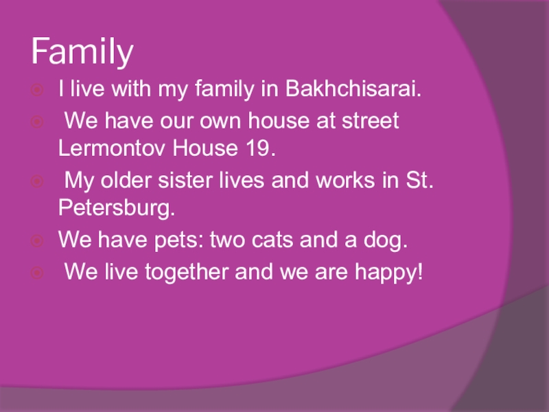 FamilyI live with my family in Bakhchisarai. We have our own house at street Lermontov House 19.