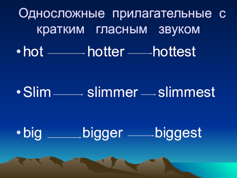 Односложные прилагательные с кратким  гласным  звукомhot      hotter