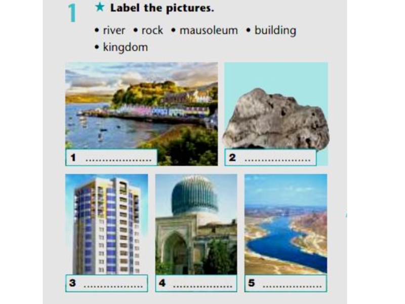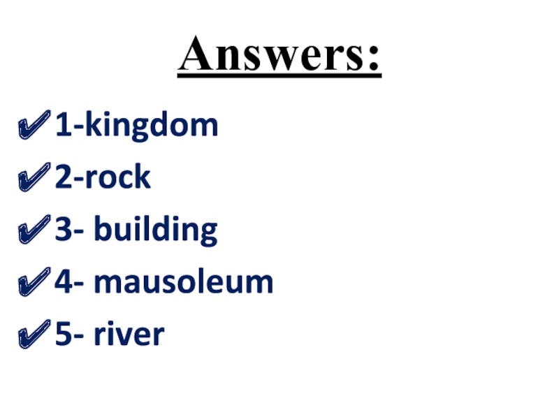 Answers:1-kingdom2-rock3- building4- mausoleum5- river