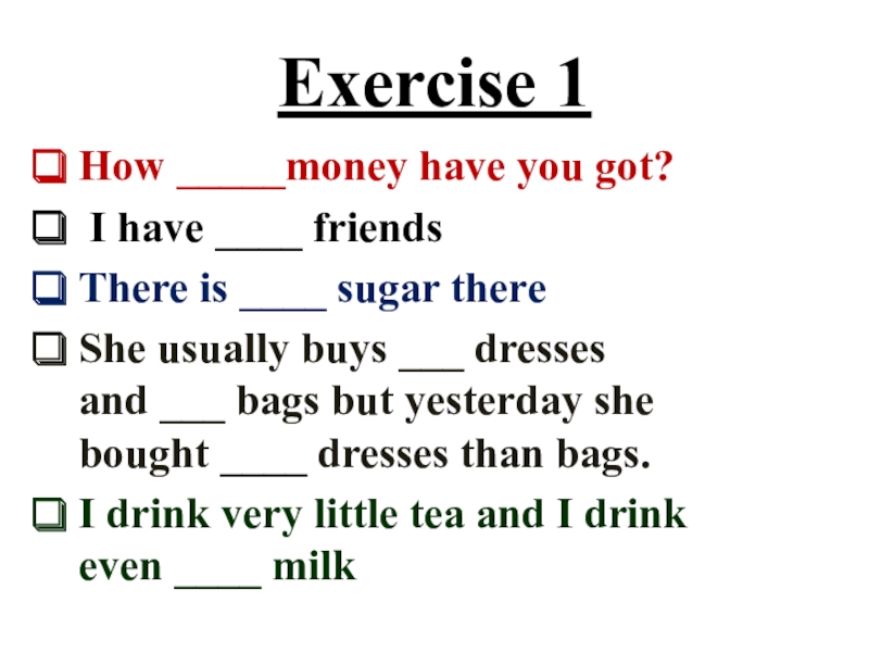 Exercise 1 How _____money have you got? I have ____ friendsThere is ____ sugar thereShe usually buys ___ dresses