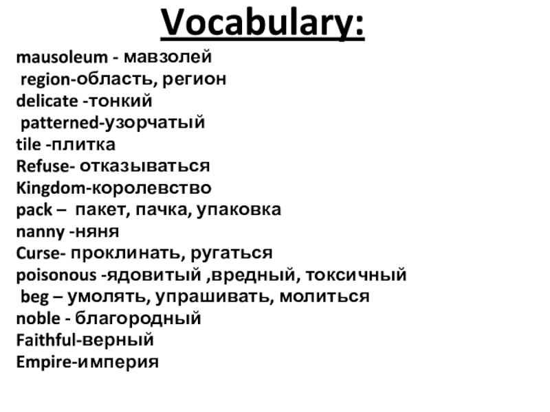 Vocabulary:mausoleum - мавзолей region-область, регион delicate -тонкий patterned-узорчатыйtile -плиткаRefuse- отказыватьсяKingdom-королевствоpack – пакет, пачка, упаковка nanny -няняCurse- проклинать,