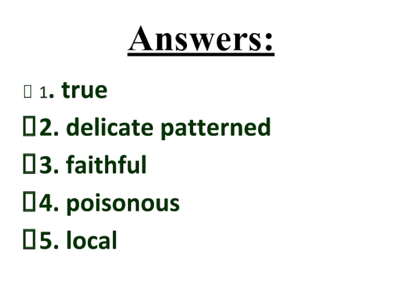 Answers:1. true2. delicate patterned3. faithful4. poisonous5. local