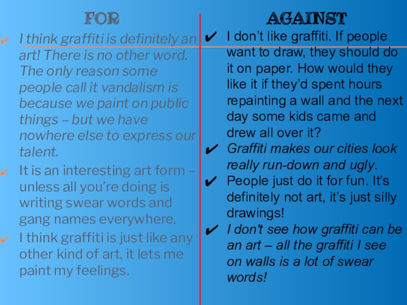 I don't see how graffiti can be an art – all the graffiti I see on walls is a lot of swear words!