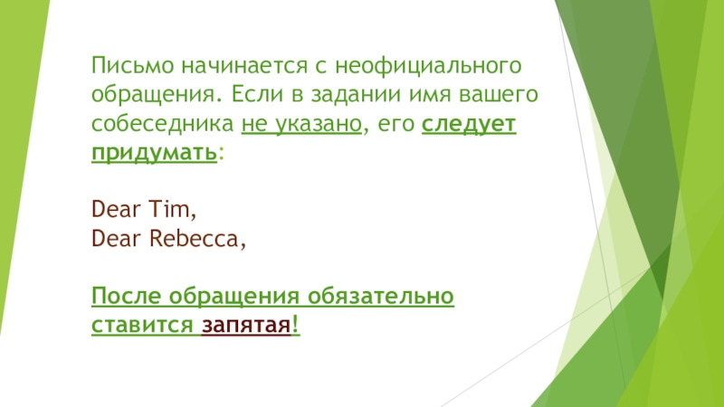 Слайд 4Письмо начинается с неофициального обращения. Если в задании имя вашего собеседника