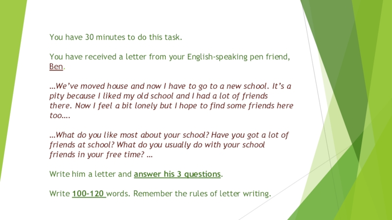 Предполагается, что письмо должно быть написано в неформальном стиле, поэтому вы должны использовать стяженые формы (краткие формы) don’t, I’d, I’m, неформальные слова-связки, такие как well, by the way, anyway, so, разговорные выражения типа Guess what? Или Wish me luck!, а также восклицательные знаки.