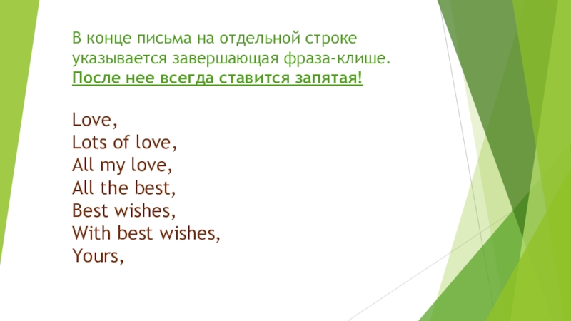 Слайд 11В конце письма на отдельной строке указывается завершающая фраза-клише. После нее