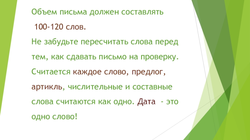 тем, как сдавать письмо на проверку. Считается каждое слово, предлог, артикль, числительные и составные слова считаются как одно. Дата - это одно слово!