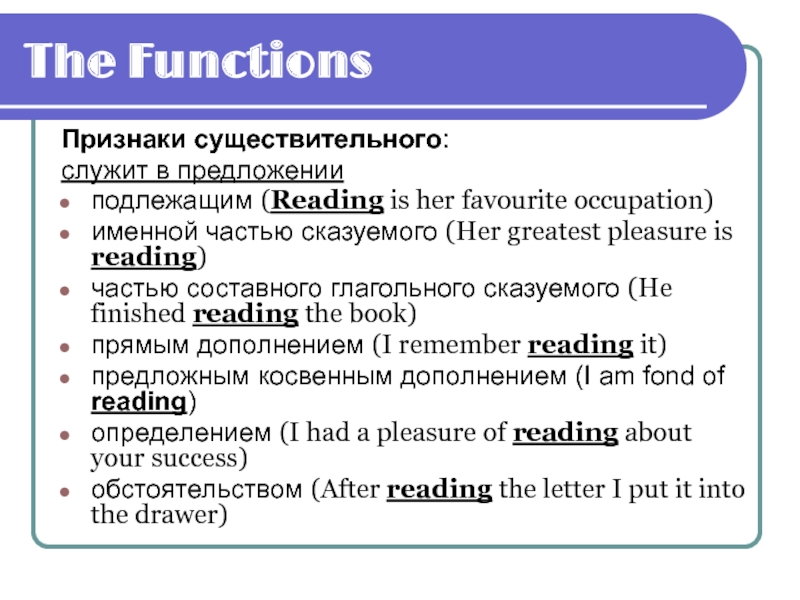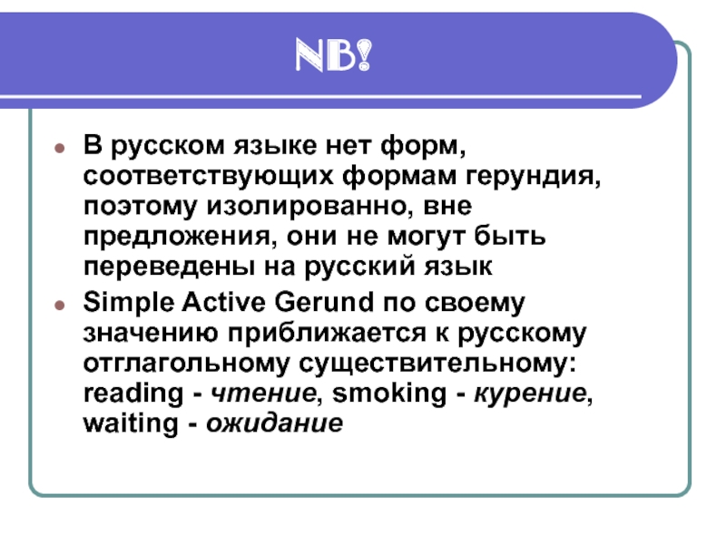 Simple Active Gerund по своему значению приближается к русскому отглагольному существительному: reading - чтение, smoking - курение, waiting - ожидание