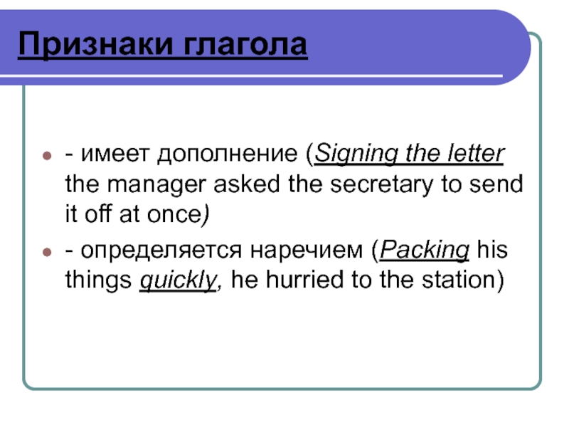 - определяется наречием (Packing his things quickly, he hurried to the station)