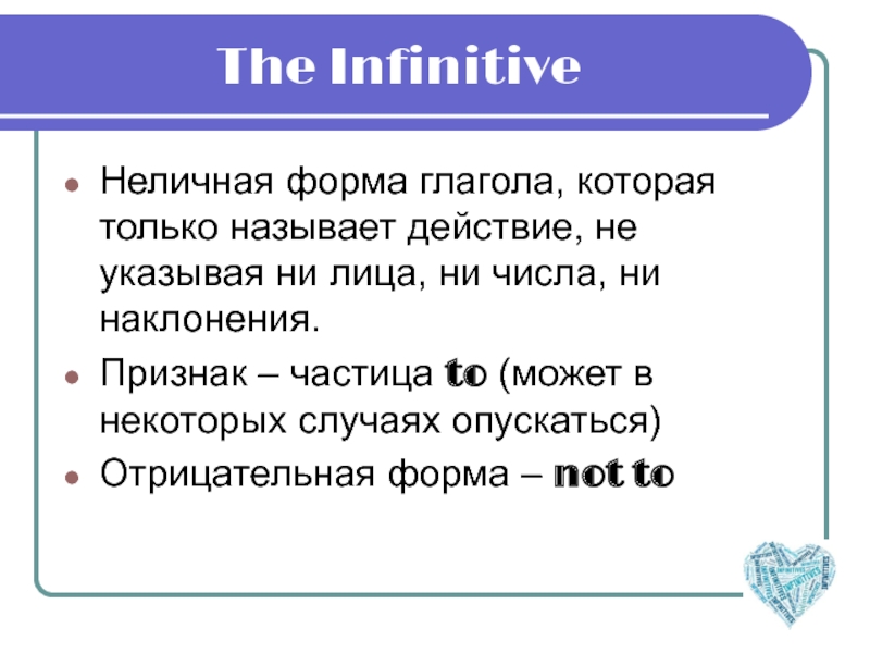 Неличная форма глагола, которая только называет действие, не указывая ни
