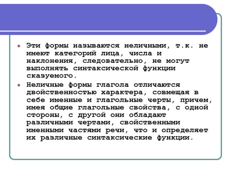 Слайд 3Эти формы называются неличными, т.к. не имеют категорий лица, числа и