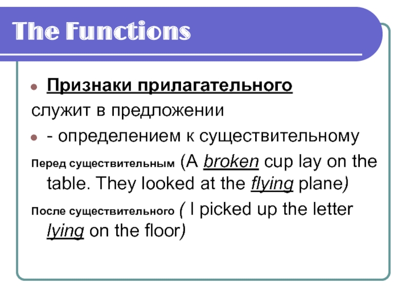 - сопутствующих обстоятельств (She was cleaning the room singing)