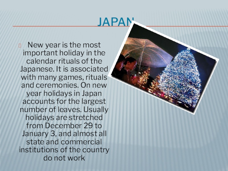 of the Japanese. It is associated with many games, rituals and ceremonies. On new year holidays in Japan accounts for the largest number of leaves. Usually holidays are stretched from December 29 to January 3, and almost all state and commercial institutions of the country do not work