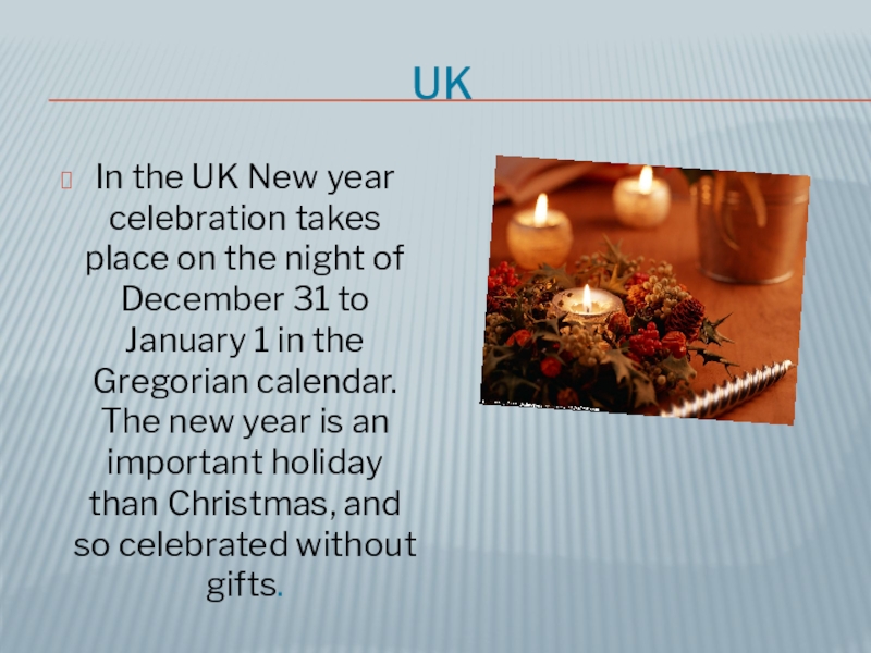 UKIn the UK New year celebration takes place on the night of December 31 to January 1 in the Gregorian calendar. The new year is an important holiday than Christmas, and so celebrated without gifts.