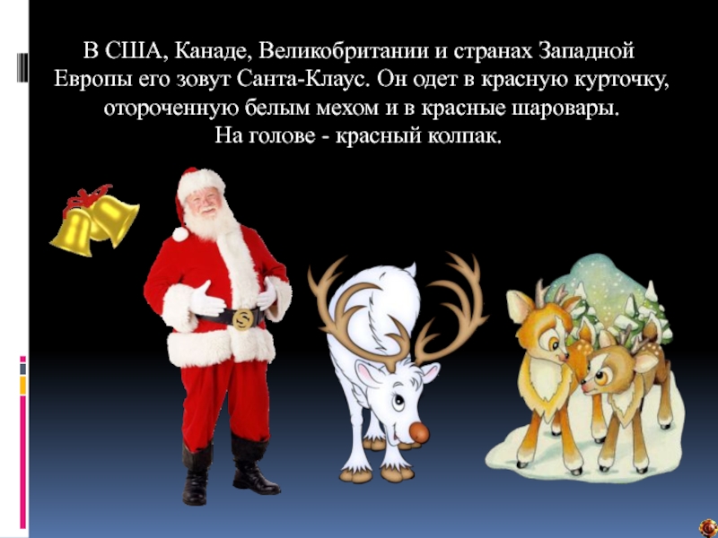 В США, Канаде, Великобритании и странах Западной Европы его зовут Санта-Клаус. Он одет в красную курточку, отороченную