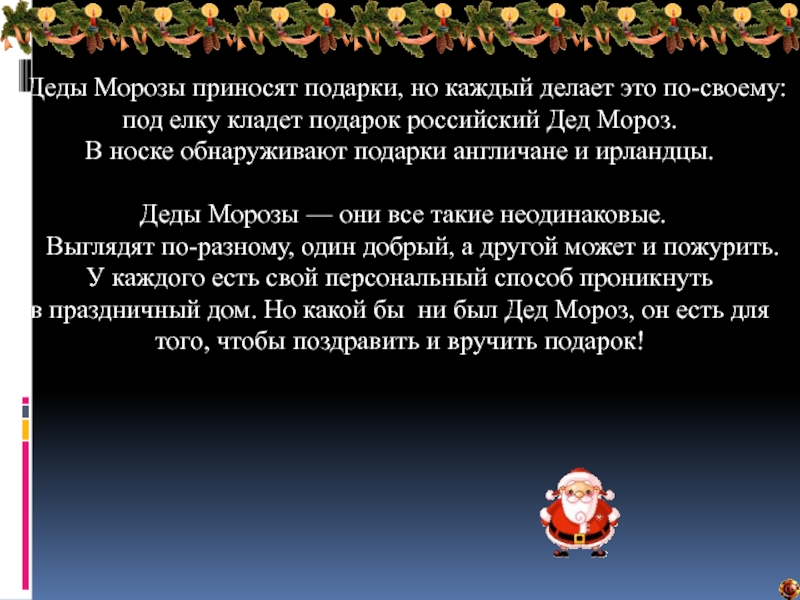 Слайд 5 Деды Морозы приносят подарки, но каждый делает это по-своему: под елку