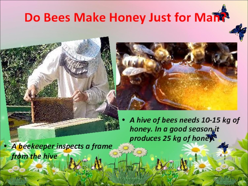 A hive of bees needs 10-15 kg of honey. In a good season it produces 25 kg of honey.