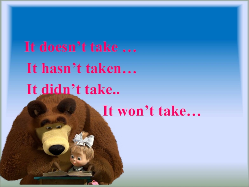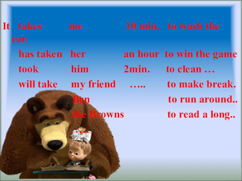 Презентация, доклад по английскому языку. Объяснение и отработка структуры It takes...