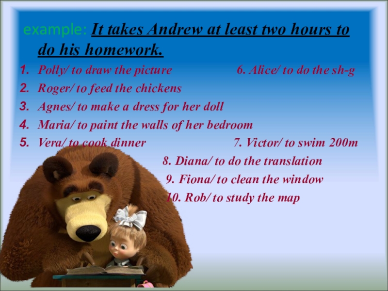 example: It takes Andrew at least two hours to do his homework.Polly/ to draw the picture