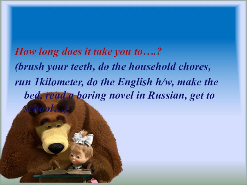How long does it take you to….?(brush your teeth, do the household chores,run 1kilometer, do the English