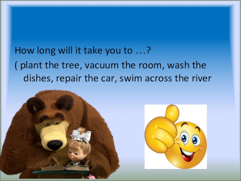 How long will it take you to …?( plant the tree, vacuum the room, wash the dishes,