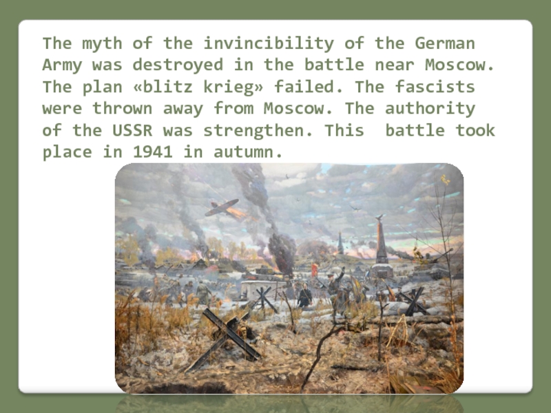 The myth of the invincibility of the German Army was destroyed in the battle near Moscow. The plan «blitz krieg» failed. The fascists were thrown away from Moscow. The authority of the USSR was strengthen. This