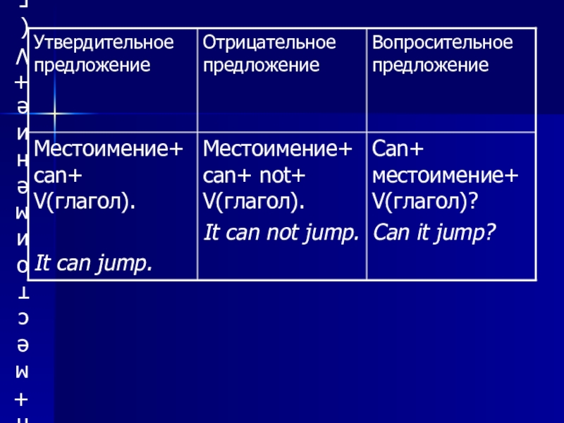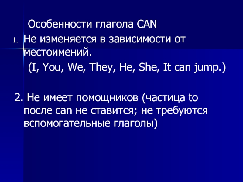 Особенности глагола CANНе изменяется в зависимости от местоимений.  (I, You, We, They, He, She,