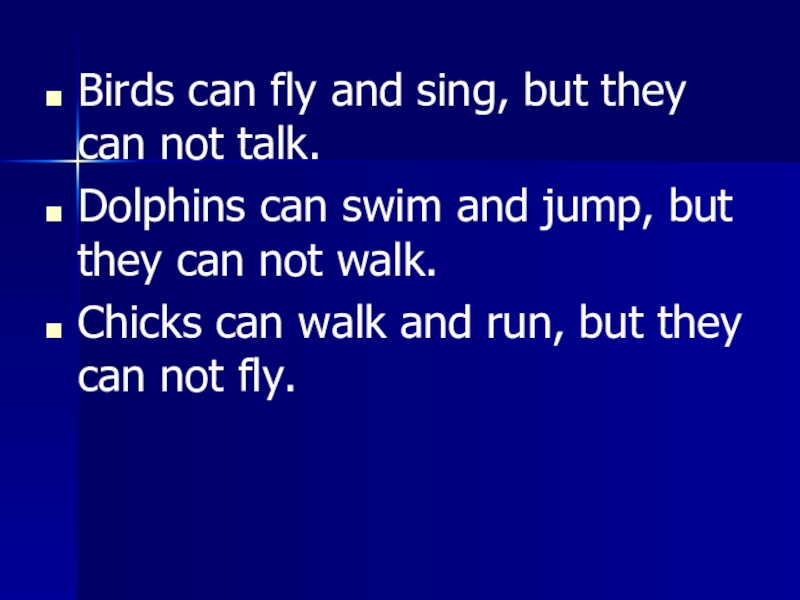 Birds can fly and sing, but they can not talk.Dolphins can swim and jump, but they can