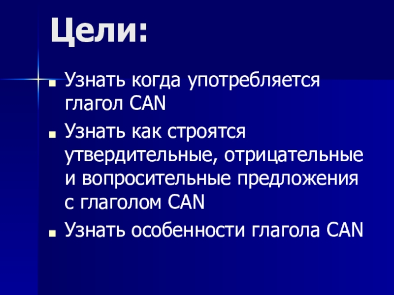 Цели: Узнать когда употребляется глагол CANУзнать как строятся утвердительные, отрицательные и вопросительные предложения с глаголом CANУзнать особенности