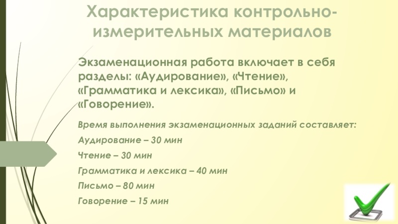 Экзаменационная работа включает в себя разделы: «Аудирование», «Чтение», «Грамматика и лексика», «Письмо» и «Говорение».