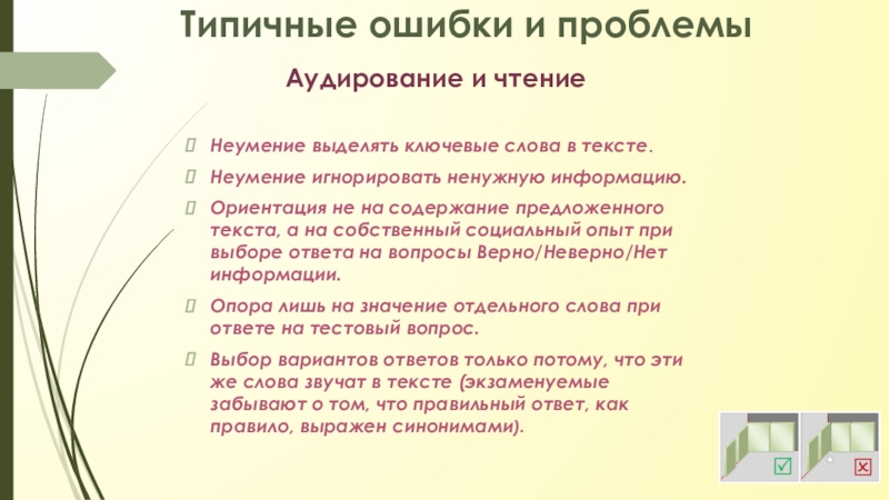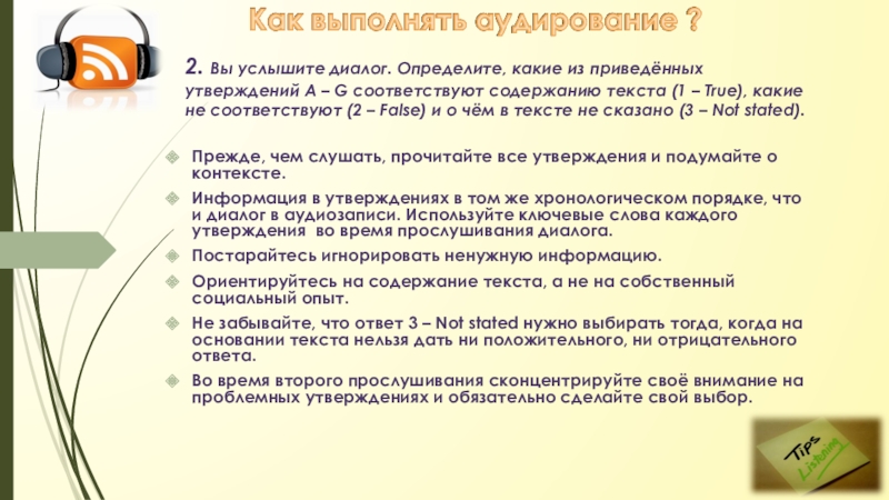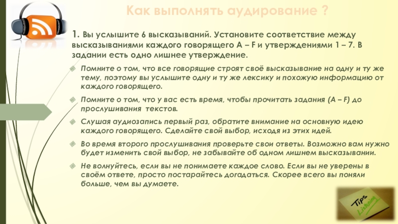 Во время второго прослушивания сконцентрируйте своё внимание на проблемных утверждениях и обязательно сделайте свой выбор.